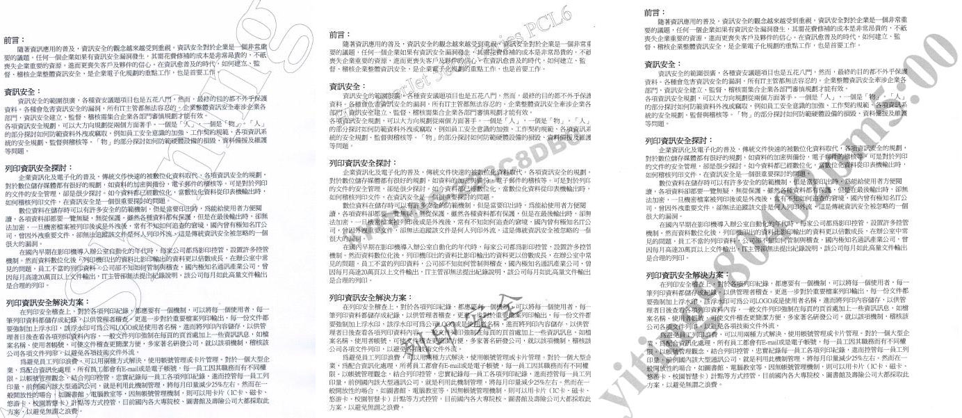 企业为了防止文件外流,最常用的功能,在每一份文件利用Watermark(浮水印)功能,在每一件文件上加上讯息,例如:公司logo、禁止拷贝、文件名称等。在企业中Watermark运用于文件中是很广泛的,由于Watermark可以含盖整个文件,对于企业文件识别,非常有用,但是目前Watermark提供的功能,都是被动式的,也就在文件上,自己加上去,或是在印表时,由列印驱动程式提供之功能,自己设定。如果有心人士,要将文件印出,可以将文件的Watermark标志取消,或是在列印时将印表之Watermark功能取消。
