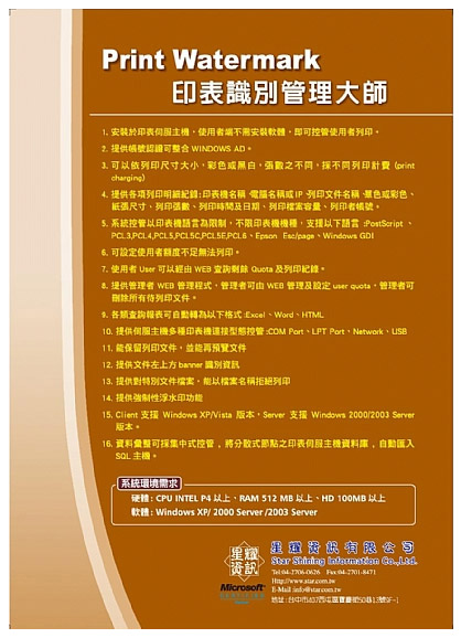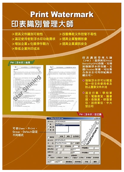 Print Watermark为星耀资讯列印管理家族中最强的软体,不但提供基本版Print Quota,及进阶版Print Security所有功能外,并在资讯安全管理上,增加了浮水印(watermark)功能,也针对传统浮水印,没有强制性缺点,特别改正。只要在列印主机,建置Print Watermrk系统,任何输出文件,系统会依Print Watermark功能参数设定,强制在每一份文件,自动加上浮水印,浮水印参数包含公司logo、自定文字内容、使用者名称、电脑名称、文件名称、时间日期,各项参数可以混合使用。