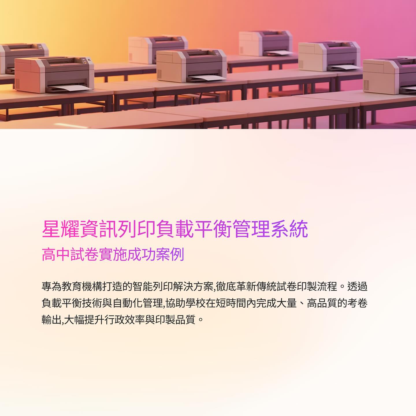 透過列印負載平衡與設備整合管理, 不僅讓試卷印製流程更有效率,也讓行政作業更加簡單穩定。 若學校正在尋找更完善的列印管理方案, 星耀資訊能提供從設備整合到自動化輸出的完整支援。