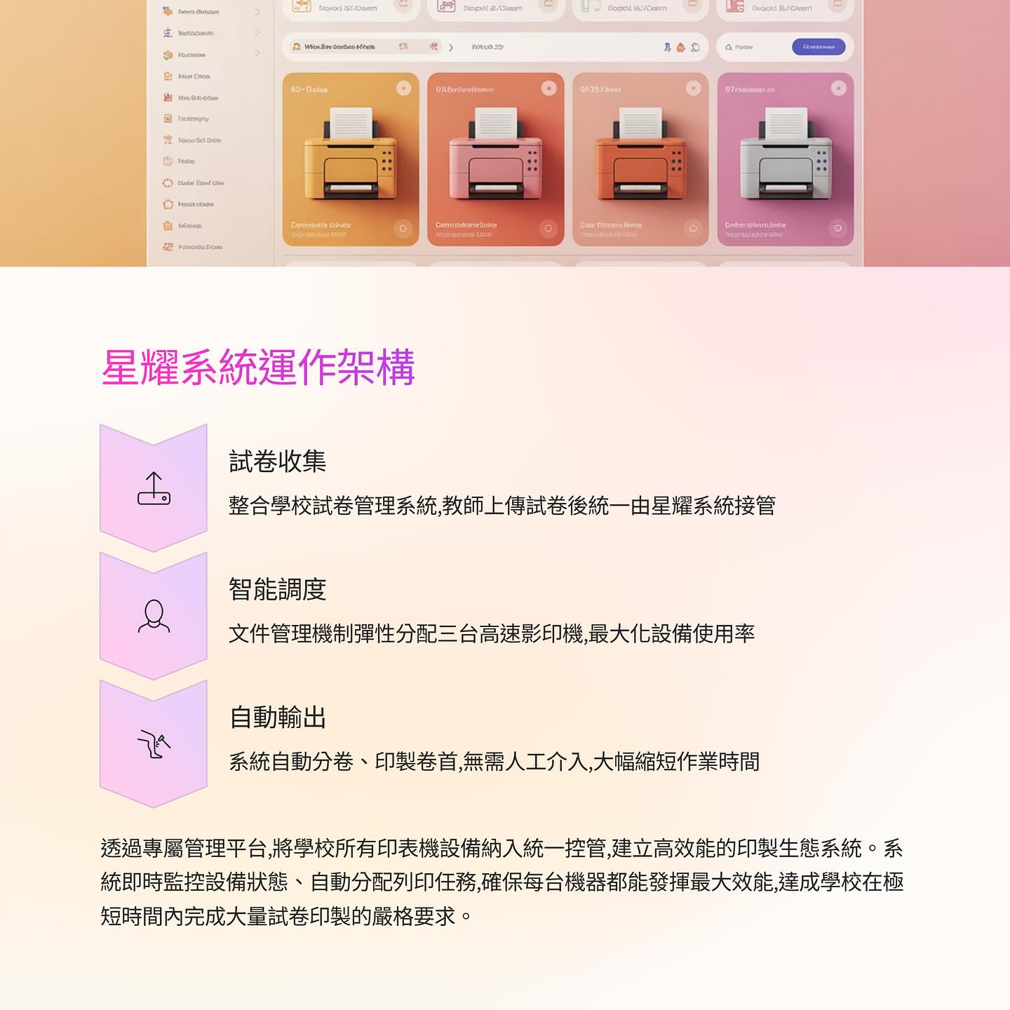 為了改善這些問題,學校導入星耀資訊的列印負載平衡管理系統, 將全校試卷集中管理,並自動分配至不同高速影印機, 讓列印流程更順暢,也減少人工介入所造成的錯誤。