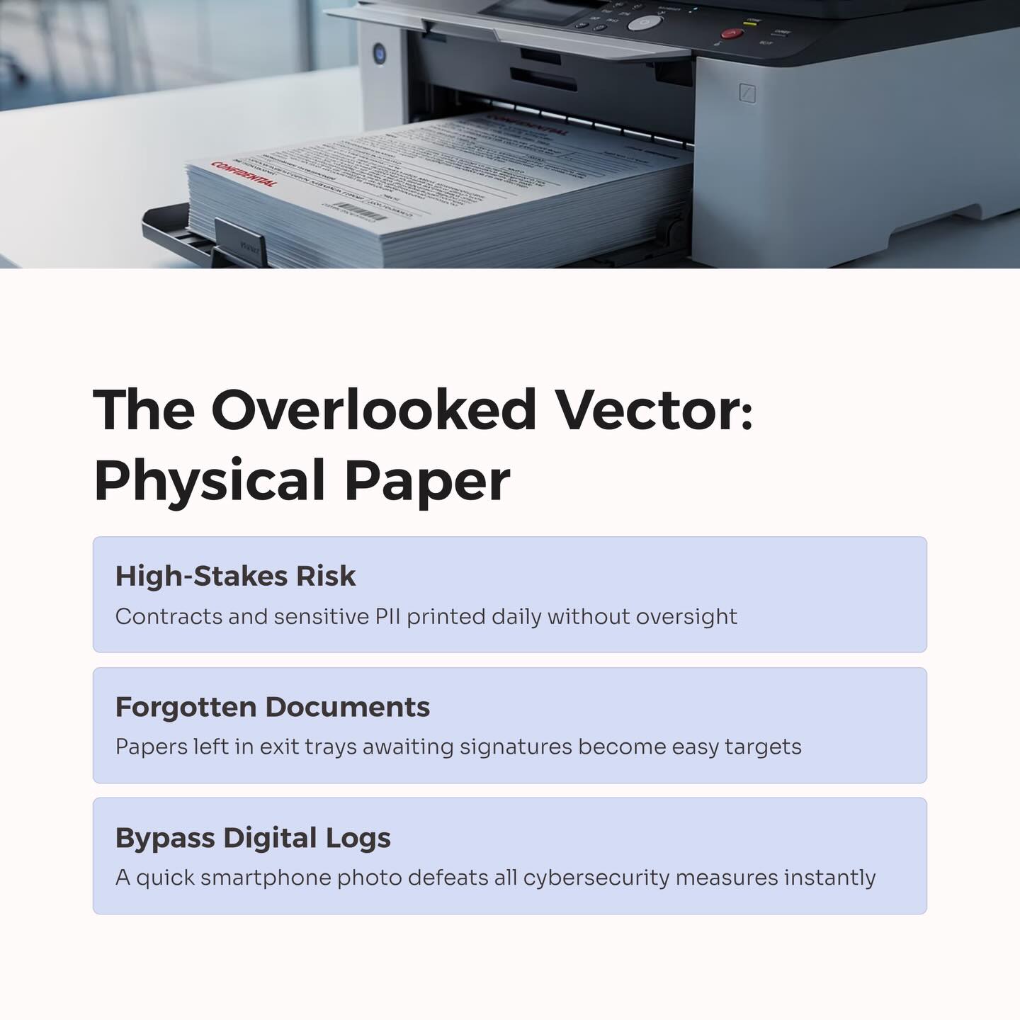 The Cybersecurity Paradox is real: you can have world-class digital encryption, but once sensitive PII or proprietary blueprints are printed for review, your digital logs go dark. A single smartphone photo of a document can render your entire digital defense obsolete. This is the “analog loophole” that modern threat actors and internal vulnerabilities exploit daily.